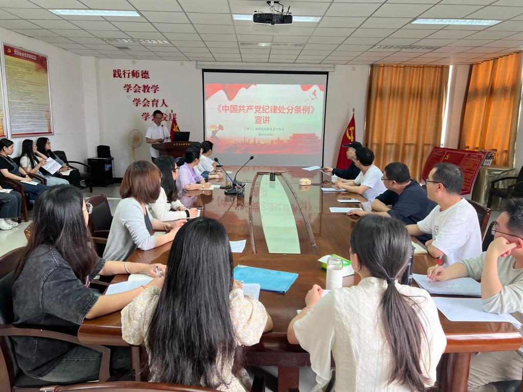 5月24日下午,为深入贯彻落实党纪学习教育工作要求,教育引导全院党员师生学纪、知纪、明纪、守纪,根据校纪委部署要求和公司党委工作安排,院党委纪检兼组织委员叶陈清在求实楼D401会议室就《中国共产党纪律处分条例》作专题宣讲报告。