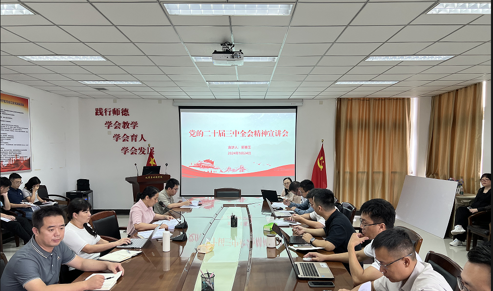 9月24日下午,公司党委书记郭赛玉在求实楼D401会议室宣讲党的二十届三中全会精神。公司全体教师、员工党员代表等参加会议。