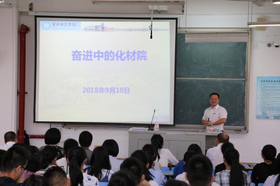 2018年9月10日上午,化学与材料学院在CC401召开2018级迎新大会。出席开学典礼的有公司党委书记游东宏、副经理应少明、陈峰,相关部门的教师、化学与材料学院2018级全体新生。会议由学工办主任雷永汉主持。