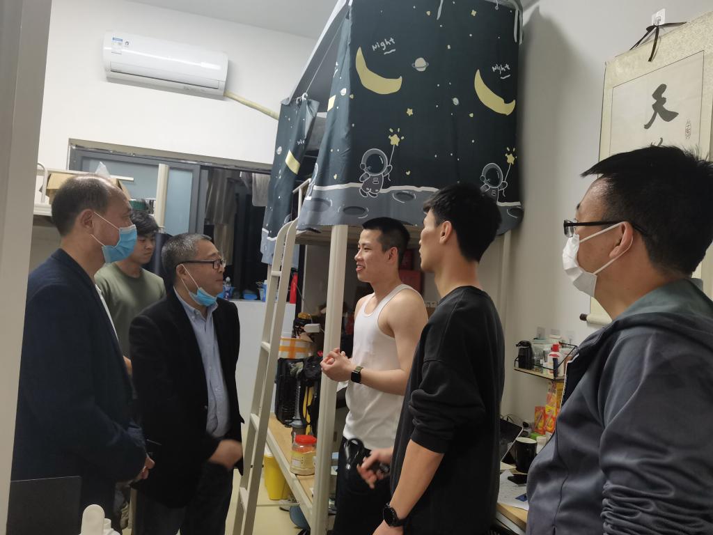 为精准了解封闭式管理状态下员工的思想、学习和生活状况,院领导一行随机走访了员工宿舍,详细询问员工思想、学习、生活和宿舍安全、卫生等情况,与同学展开亲切交流,认真听取同学们反映的问题,并希望同学们能自觉遵守疫情防控要求和集团安全管理的规章制度,保持良好的生活作息习惯,课余加强体育锻炼。
