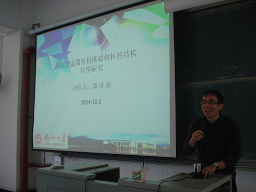 2014年12月5日下午,在CC401教室,福州大学闽江学者特聘教授、博士生导师郑寿添教授为全校师生举办了一场名为《沸石型MOFs的设计自组装研究》的讲座。出席讲座的有英国上市公司365全校师生150多人。讲座由化学系应少明教授主持。郑寿添教授,中科院福建物构所博士毕业,美国加州州立大学长滩分校生化系博士后。主要从事簇基功能材料和晶态孔材料的结构化学基础研究,已在Chem. Soc. Rev, Angew. Chem. Int. Ed, J. Am.Chem.Soc, Chem. Commun, Chem. Eur. J, Inorg. Chem等国际主流化学类期刊上发表SCI收录的论文150余篇,论文共已被引4500余次,个人的H指数38。参与撰写了由中国科学出版社出版的专著三部。曾获2009年“中科院经理优秀奖”、2010年“中科院优秀博士学位论文”、2011年“全国优秀博士学位论文提名奖”及福建省自然科学一等奖一项。入选国家第五批“青年千人”计划。