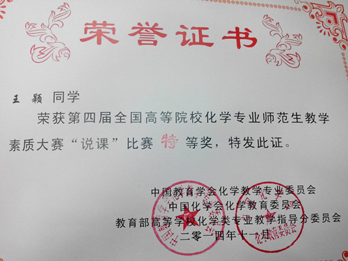 11月10日,公司化学系薛岚、周美珍和郑淑英三位老师带领11级化学专业王颖和吴丹丹两位员工,代表学校到成都参加第四届全国高等院校化学专业师范生教学素质大赛。该赛事由中国教育学会化学教学专业委员会和中国化学会化学教育委员会主办,四川师范大学承办。本次赛事,强手如云,有全国包括北京师范大学陕西师范大学、华中师范大学在内的56所高校154名选手进入决赛。经过激烈的角逐,我系王颖同学获得特等奖,吴丹丹同学获得一等奖。(周美珍)