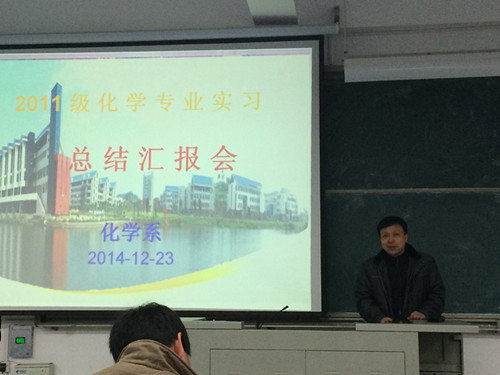 12月23日,化学系在求实楼CC401举办2011级化学专业实习总结汇报会,系主任兼系总支书记颜桂炀等在家系领导,薛岚、周美珍等实习指导教师,化学专业员工等100余人出席了汇报会。