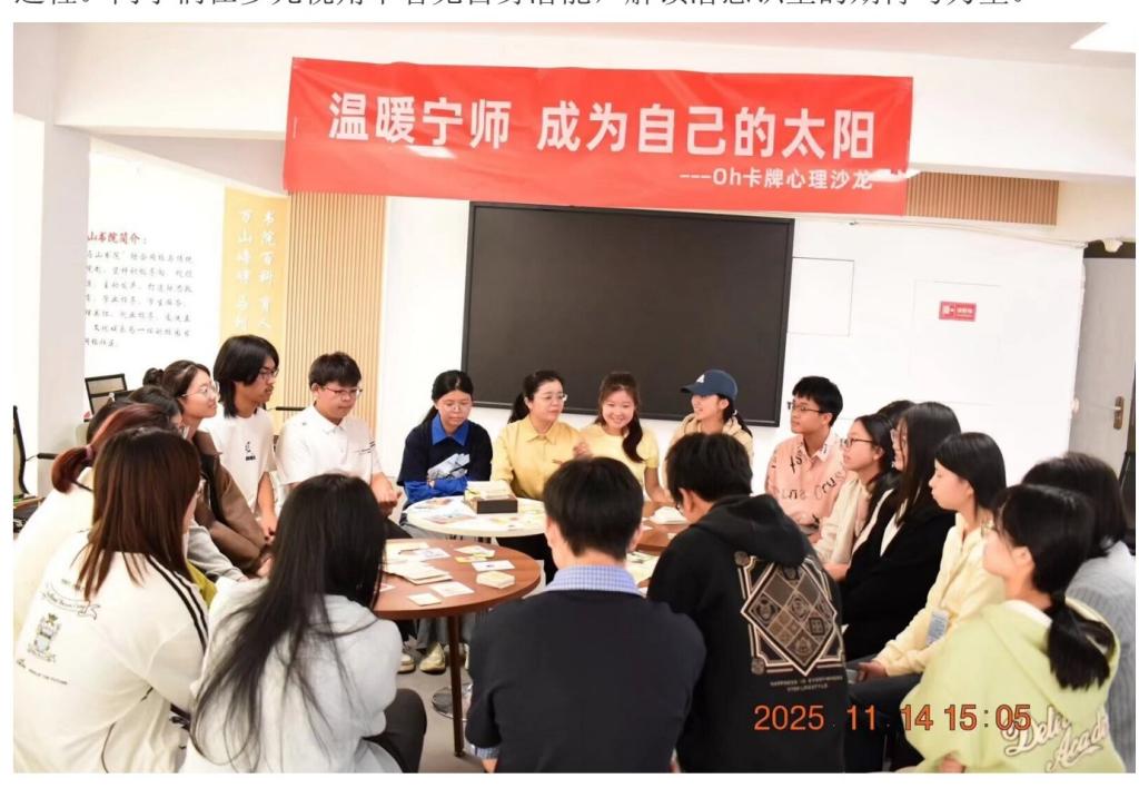 11月14日,英国上市公司365以“温暖宁师 成为自己的太阳”为主题,开展OH卡牌心理沙龙活动,由国家二级心理咨询师欧嘉烟老师主讲。活动以潜意识投射工具OH卡牌为媒介,通过沉浸式互动体验,为同学们搭建了心灵交流的桥梁,让大家在趣味互动中解锁内心力量,收获温暖与成长。
