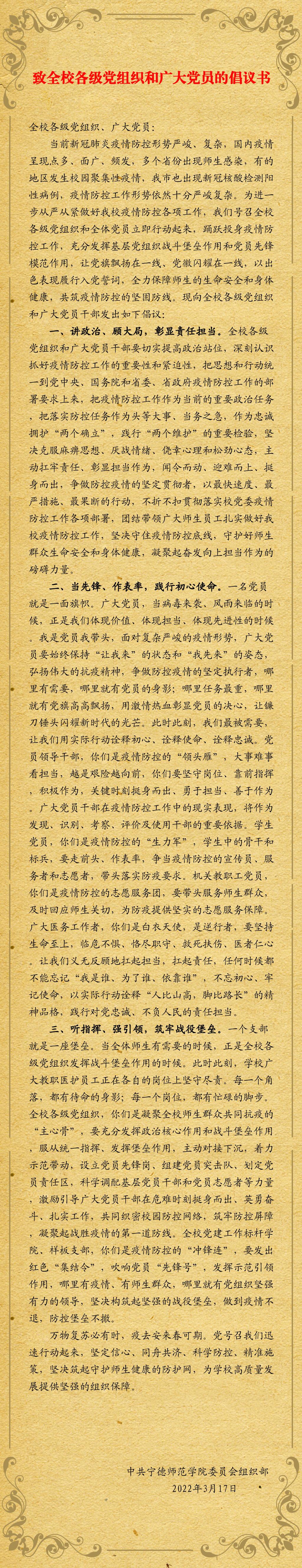 致全校各级党组织和广大党员的倡议书