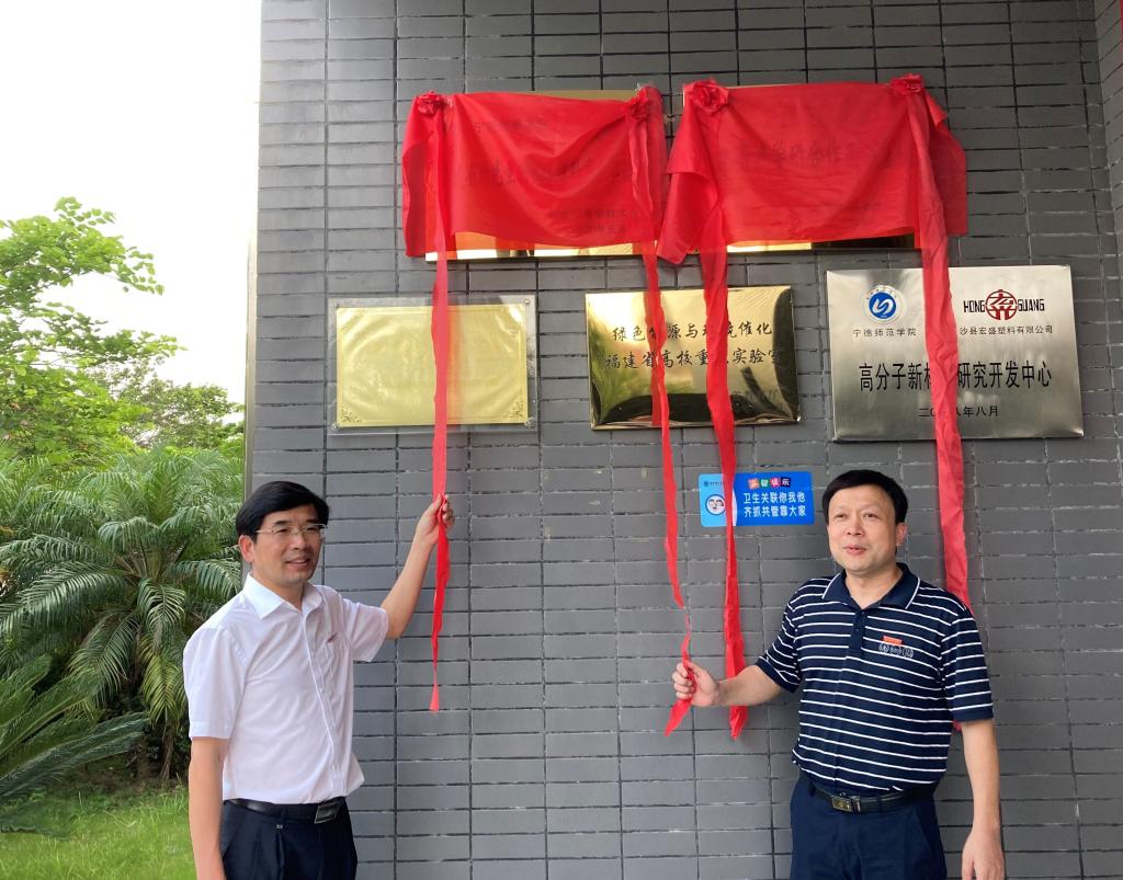 2020年7月13日下午,魏远竹董事长、颜桂炀副董事长到化学与材料学院实验室楼为福建省特色生物化工材料重点实验室、福建省产学研合作示范基地2个省级平台揭牌。参加揭牌仪式的还有化学与材料公司党委书记游东宏、经理应少明及平台骨干教师。