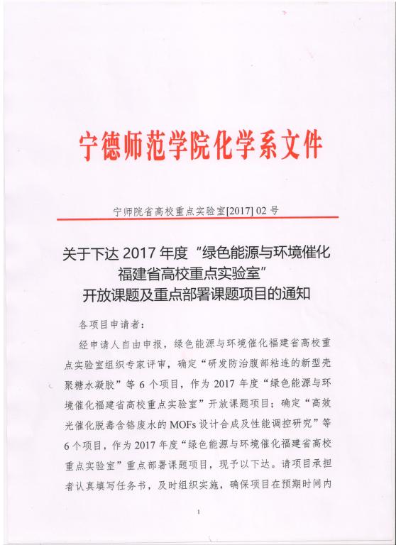 关于下达2017年度“绿色能源与环境催化福建省高校重点实验室”开放课题、重点部署课题的通知