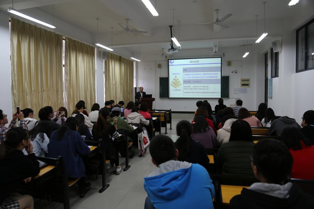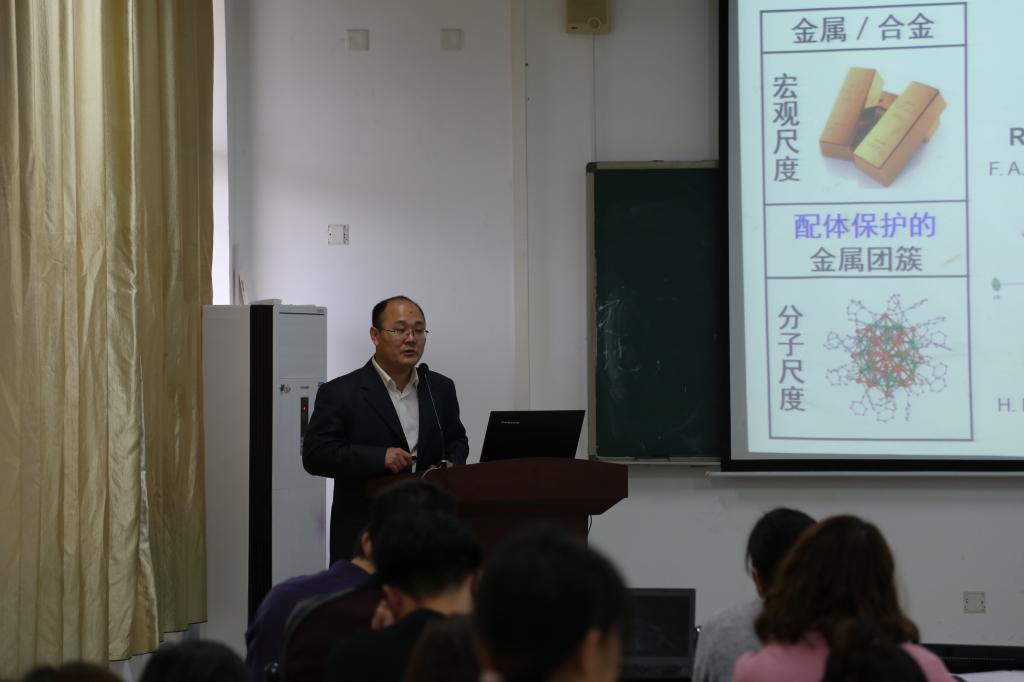 2017年11月29日上午,中科经理春应用化学研究所孙忠明研究员在求实楼CC402报告厅为化学与材料学院师生举办了一场题为《芳香性作用的全金属团簇:合成与成键》的讲座。讲座由化学与材料学院副经理应少明主持。参加讲座的有应用化学专业以及材料化学专业教师、15级应用化学专业员工共七十余名。