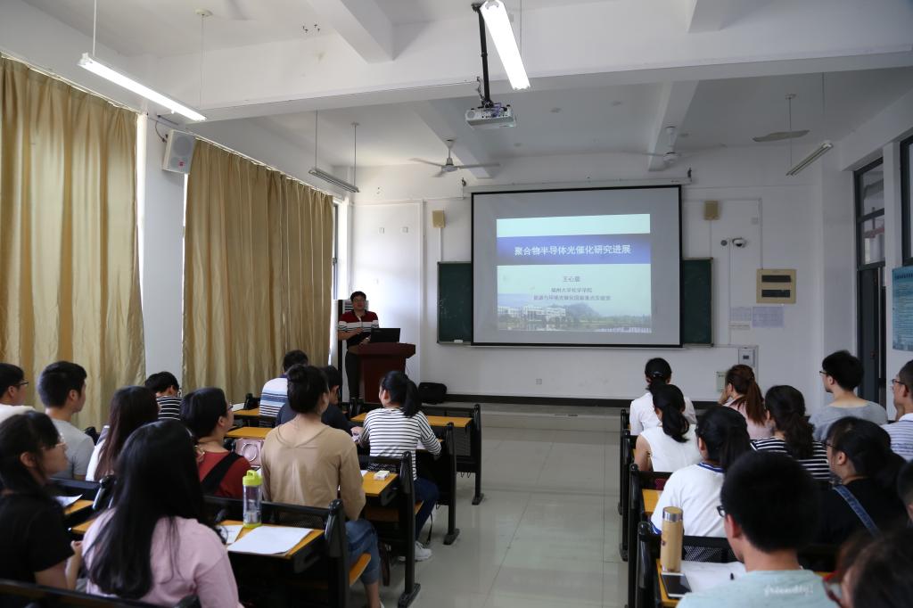 2018年5月18日上午,福州大学王心晨教授在求实楼CC402报告厅为化学与材料学院师生举办了一场题为《聚合物半导体光催化研究进展》的讲座。讲座由化学与材料学院副经理应少明主持。参加讲座的有应用化学专业以及材料化学专业教师、15级应用化学专业员工共七十余名。