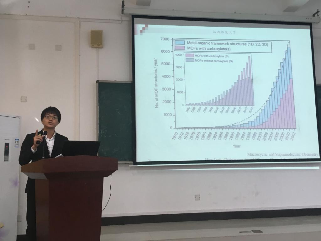 2018年11月8日上午,江西师范大学何纯挺教授在求实楼CC402报告厅为化学与材料学院师生举办了一场题为《环境与能源中的金属有机框架》的讲座。讲座由化学与材料学院副经理应少明主持。参加讲座的有化学与材料学院师生共八十余名。