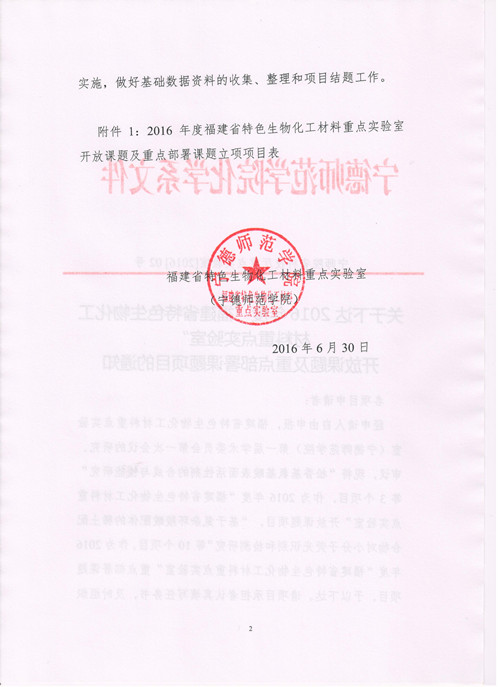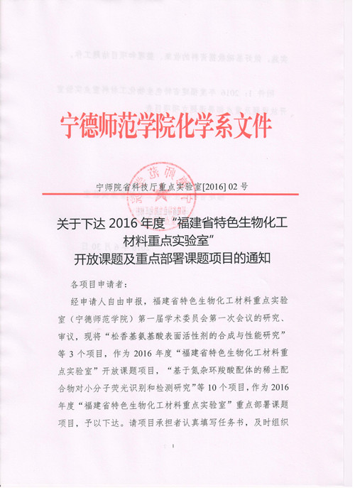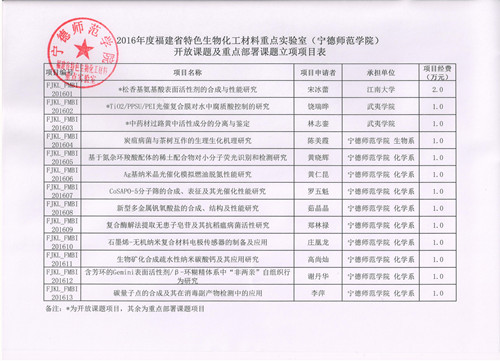 关于下达2016年度“福建省特色生物化工材料重点实验室” 开放课题及重点部署课题项目的通知