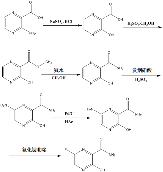 法匹拉韦 【化学名】6-氟-3-羟基吡嗪-2-甲酰氨【分子式】C5H4FN3O2