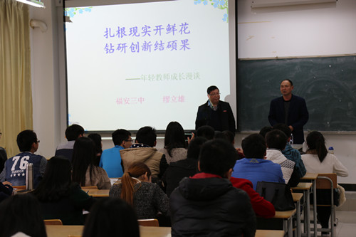 2015年12月8日福安三中李成文董事长、缪立雄书记及谢仙雄教导处主任应邀到我系传经送宝。下午2:30,李成文董事长和谢仙雄教导处主任与我系教师进行座谈,李董事长以福安三中为例详细介绍了微课与翻转教学开展的方式、取得的成果及所遇到的困难,并就双方教研合作与课题申报等方面进行了深刻的交流并取得一致的看法。
