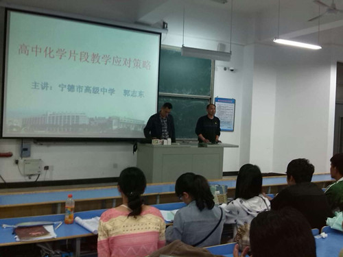 化学系卓越教师团队邀请宁德市高级中学郭志东老师做《高中化学片段教学应对策略》讲座。讲座由游东宏副主任主持,系卓越教师团队教师和卓越班和11级、12级师范类员工聆听了讲座。在讲座过程中,郭老师将员工在平时片段教学中容易出现的问题逐一列出,并进行分析,结合自身多年从教经验总结出八点经验:1、不能准确解读课表;2、与说课杂糅或脱节;3、忽视片段教学设计;4、教学内容处理不当;5、无法虚拟双边活动;6、把握不好教学时间;7、过程细节注意不够;8、科学性错误易犯。最后,在评课环节同学们表现的十分踊跃,将整个讲座推向高潮。整场讲座,启人深思,此次讲座对我系卓越教师培养计划和即将开展的师范类实习具有一定的指导意义。