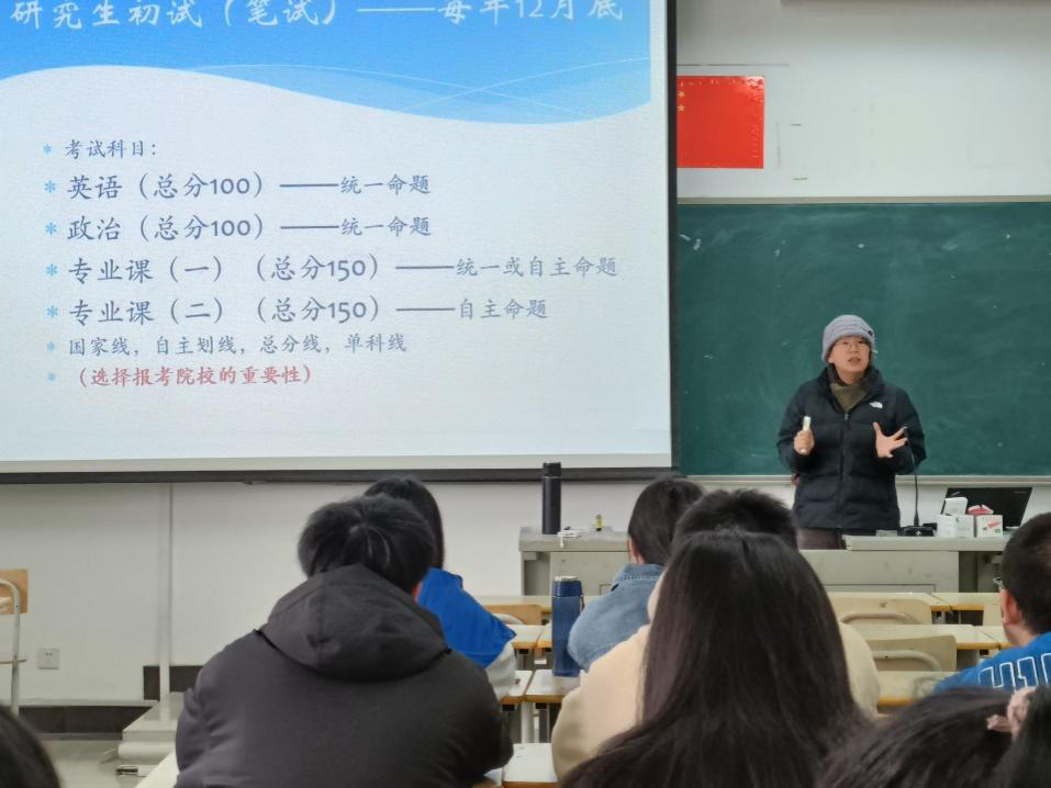 会上,谢丹华老师结合近几年分数线变化情况,分析了当前考研形势。她以“勤奋”、“计划”、“心态”三个关键词讲解了考研科目的准备、考研院校的选择、复试应对技巧以及心态调节。她强调了对考研目标院校和专业选择的重要性,同时要求同学们应从细节入手,逐个击破,做到考研方向不选错,考研知识点不遗漏,准备充分不松懈。会后,同学们针对自己在备考中所遇到的问题和困惑,3位老师根据以往的经验和经历进行耐心细致地解答。